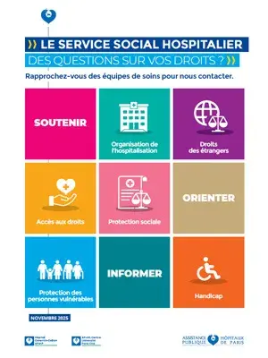 Retrouvez toutes informations dans la plaquette de présentation du service social hospitalier de l'hôpital Corentin-Celton.